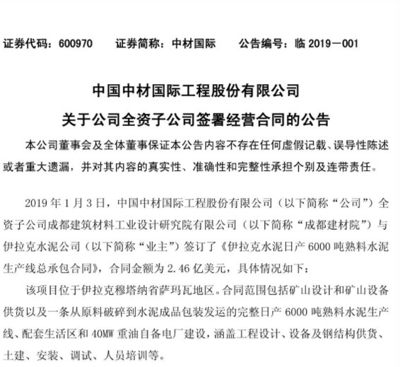 2019年1月3日,中國(guó)中材國(guó)際工程股份有限公司(以下簡(jiǎn)稱“公司”)全資子公司成都建筑材料工業(yè)設(shè)計(jì)研究院有限公司(以下簡(jiǎn)稱“成都建材院”)與伊拉克水泥公司(以下簡(jiǎn)稱“業(yè)主”)簽訂了《伊拉克水泥日產(chǎn)6000噸熟料水泥生產(chǎn)線總承包合同》,合同金額為2.46億美元。合同約定,合同生效后26個(gè)月出熟料,合同生效后37個(gè)月達(dá)標(biāo)達(dá)產(chǎn)。