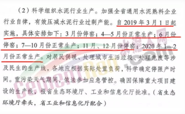 文件要求水泥行業(yè)科學組織生產(chǎn),加強水泥熟料企業(yè)自律,有效壓減水泥行業(yè)過剩產(chǎn)能。自3月1日起停窯限產(chǎn),4、5月正常生產(chǎn),6月停限,7-10月正常生產(chǎn),11、12月停窯。共計停限4個月,加上2019年1、2月份的停窯限產(chǎn),河南省2019年也要停限產(chǎn)6個月(180天)以上。