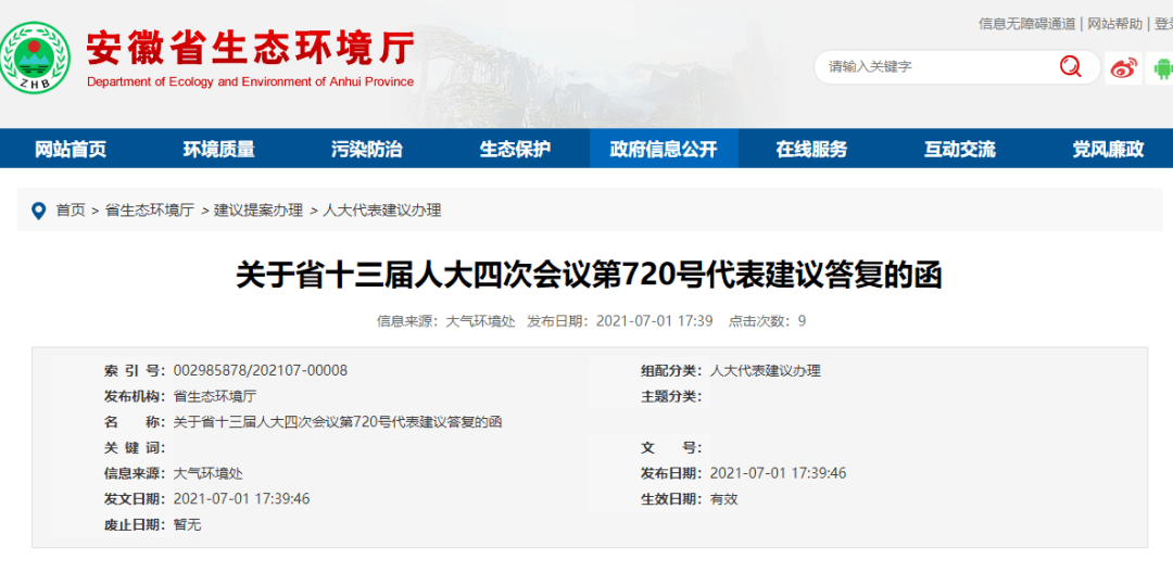 日前,安徽省生態(tài)環(huán)境廳官網(wǎng)發(fā)布《關(guān)于省十三屆人大四次會議第720號代表建議答復(fù)的函》稱,韓先云代表在省十三屆人大四次會議期間提出的《關(guān)于進(jìn)一步加強(qiáng)大氣污染防治的建議》收悉,經(jīng)研究辦理,并給予答復(fù)。