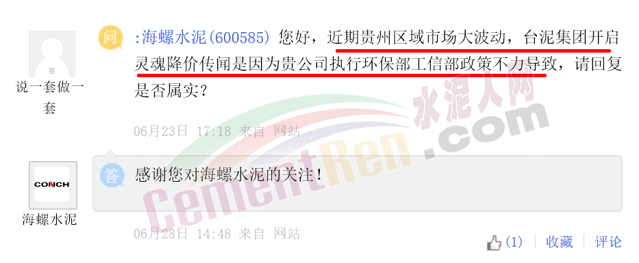 有投資者在上證e互動平臺向海螺水泥提問稱,近期貴州區(qū)域市場出現(xiàn)較大波動,臺泥集團(tuán)開啟靈魂降價,傳聞是因?yàn)楹B菟鄨?zhí)行環(huán)保部工信部政策不力導(dǎo)致,請回復(fù)是否屬實(shí)?海螺水泥上市公司回復(fù)“感謝您對海螺水泥的關(guān)注”。