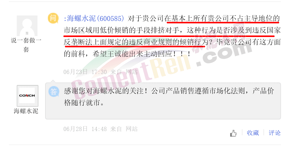 另有投資者提問,對于海螺公司在不占主導(dǎo)地位的市場區(qū)域用低價傾銷的手段排擠對手,這種行為是否涉及到違反國家反壟斷法上面規(guī)定的違反商業(yè)規(guī)則的傾銷行為?海螺水泥回復(fù)稱,公司產(chǎn)品銷售遵循市場化法則,產(chǎn)品價格隨行就市。